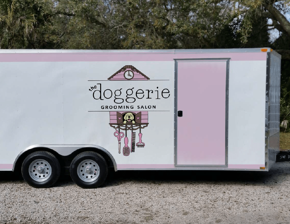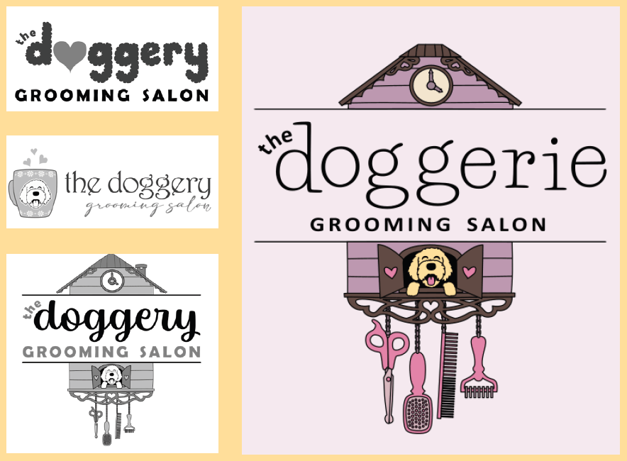 A playful, quirky logo appealing to a target demographic of “doodle” owners (curly haired poodle mixes), emphasizing the grooming salon experience as safe and welcoming for new and existing clients