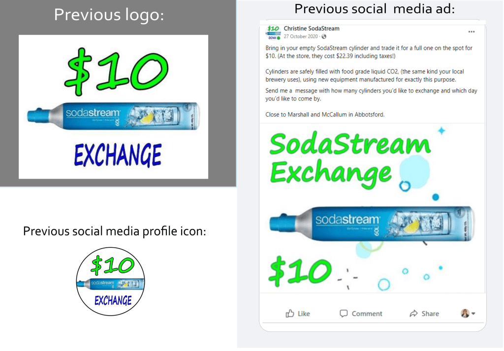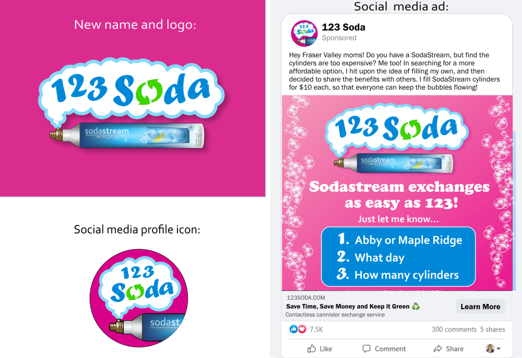 Update company name and logo with simple branding (Facebook ad only), emphasizing brand values of being friendly, local, and convenient, with a target demographic of women age 35 – 55 who use SodaStream, a beverage carbonation product.