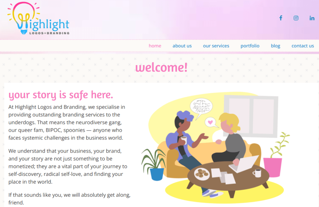 The brief: a modern, inviting logo and brand targeting queer and neurodiverse entrepreneurs, including website on WordPress with contact form.